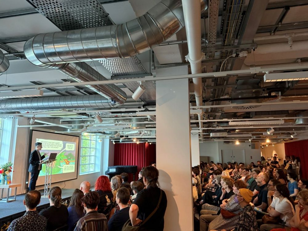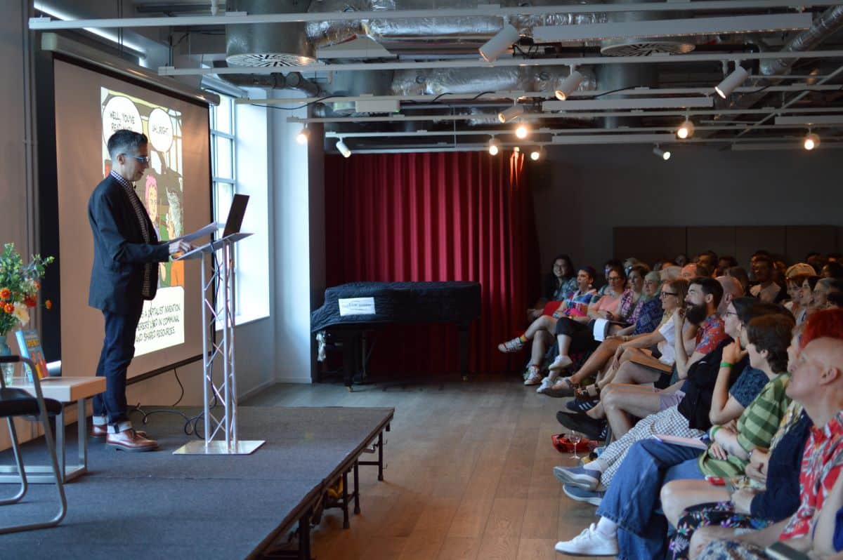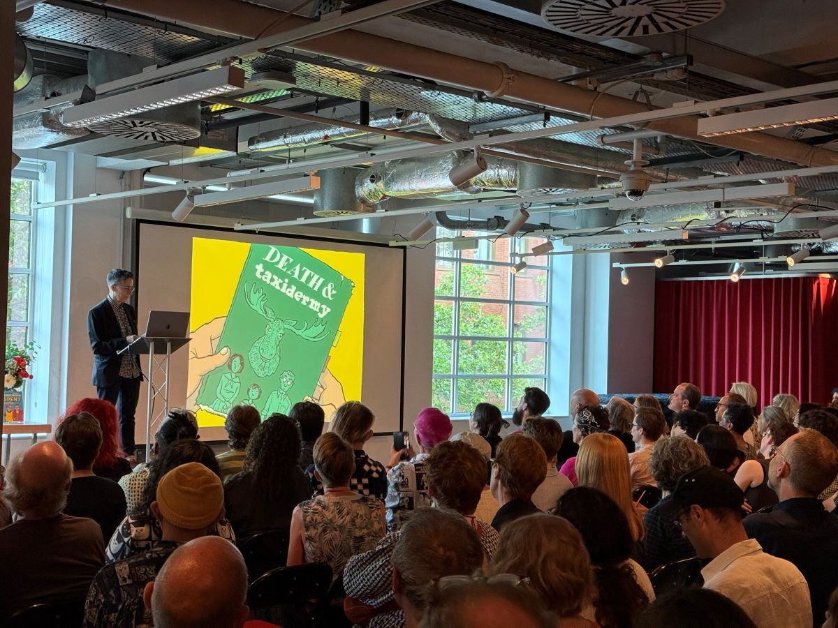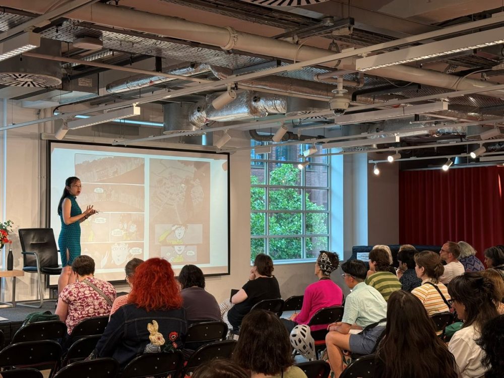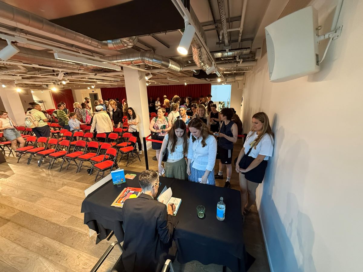 Earlier in the day, there was a pretty impressive mix of talks and signings. First was a panel – hosted by Graphic Novel Reading Room‘s Gabi Putnoki – about observational humour and life-writing featuring Becky Barnicoat (Cry When the Baby Cries), Matthew Dooley (Flake), and Simone Lia (Fluffy). Each spoke about the task of taking real-world, lived experience and finding the surreal comedy within. Barnicoat’s graphic novel adds a dose of “body horror” to the experience of becoming a parent for the first time; meanwhile, Dooley takes a familiar setting and uses it to produce sitcom-level farce, which he returns to in his latest graphic novel Aristotle’s Cuttlefish. Meanwhile, Lia brings the long-awaited sequel to her cult hit 2007 graphic novel Fluffy – about a bunny that believes he is a human child – which sees the character return and participating in the life guidance fad; it will be called How to Make Life Better When it Feels Like it’s Getting Worse. While Lia’s Fluffy sequel isn’t due for release until September, Cape Graphic Novels had a few advance copies for sale on the day (which were immediately snapped up).