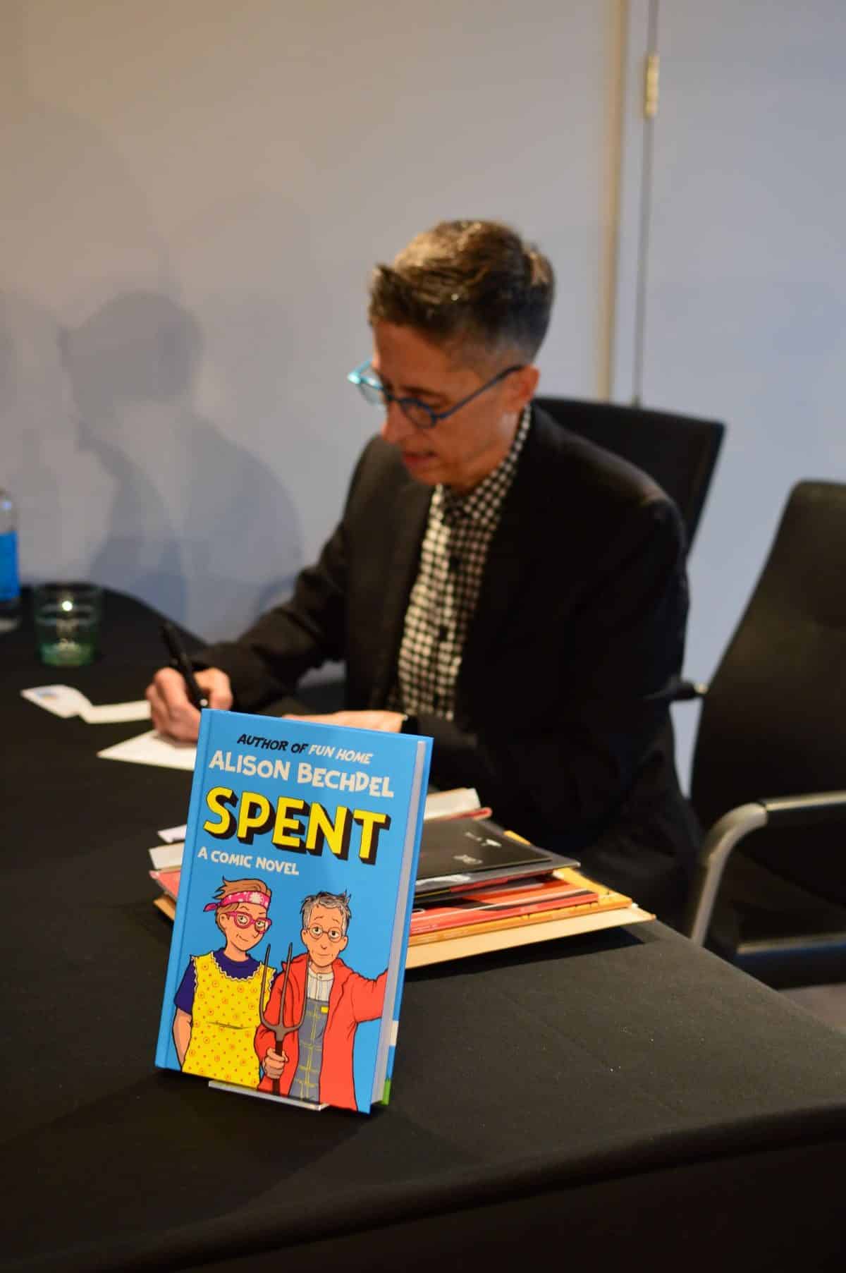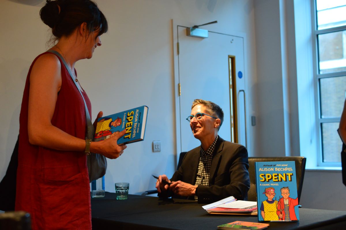 As ABechdel’s British publisher, it was probably a no-brainer to hold some kind of event showcasing her latest book, Spent, and the author herself had flown over to the U.K. Every ticket with Alison’s name featured was completely sold out on the Foyles website, and her headline talk in the evening was packed.