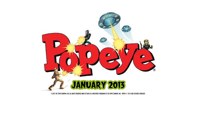 Fresh from IDW’s Twitter account comes a teaser which makes me wonder if perhaps my computer screen is somehow laced with opiates. According to the company, apparently this January a new storyline will cross Popeye with… Mars Attacks. Look, there’s an image for it and everything, I’m not lying to you: