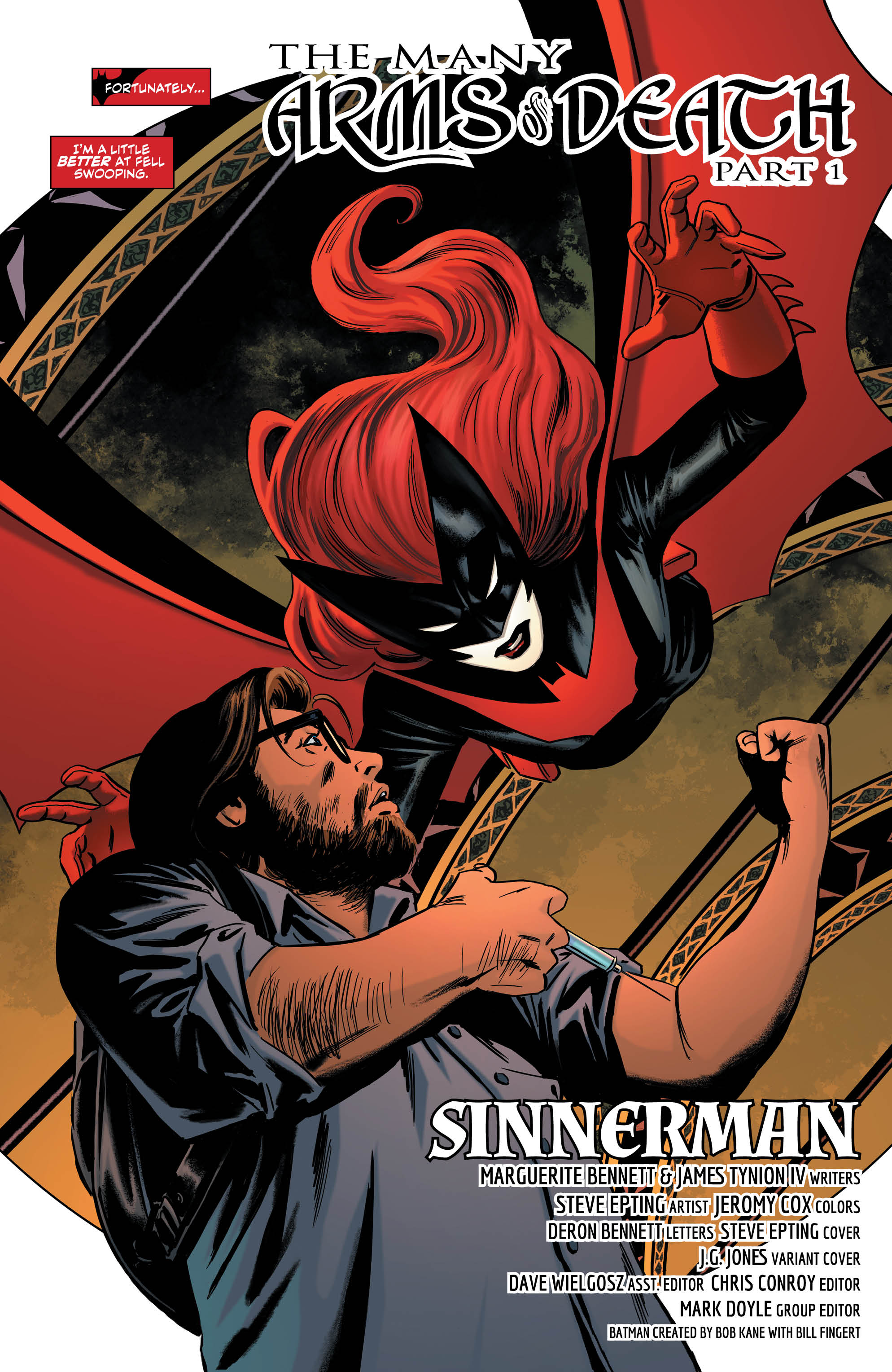 “The Many Arms Of Death” part one! At last—Batwoman is back in her own ongoing series! On the island nation of Coryana, anything goes for members of the criminal underworld…and during her lost years after being drummed out of the military, Kate Kane found a kind of refuge there. But now, a deadly new bioweapon is available in the markets of Coryana, and Batwoman will have to face up to the things she did in those days…and the people she left behind, some of whom would be happier to see her dead than alive!