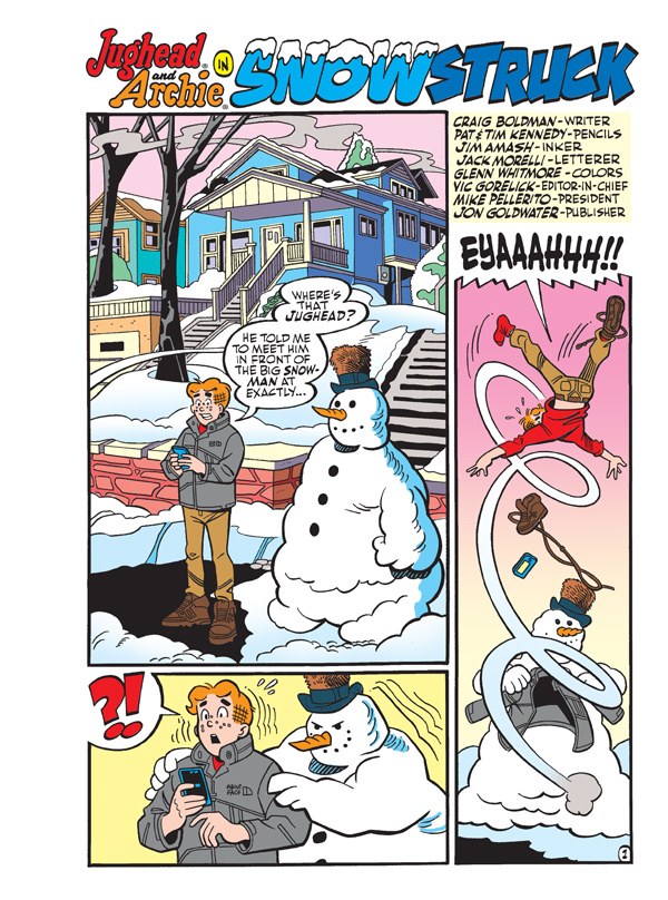 Jughead has devised the perfect winter prank—and Archie can’t wait to team up with him and get as many people as they can! But with Veronica as their first victim, will they successfully pull off their winter tricks, or will it snowball out of control and make the pranksters the prankees? Find out in “Snow Struck,” the hilarious lead story to this comics double digest featuring even more pages of winter fun!
