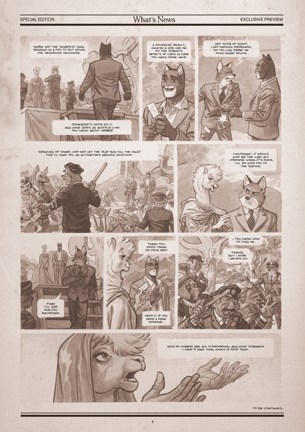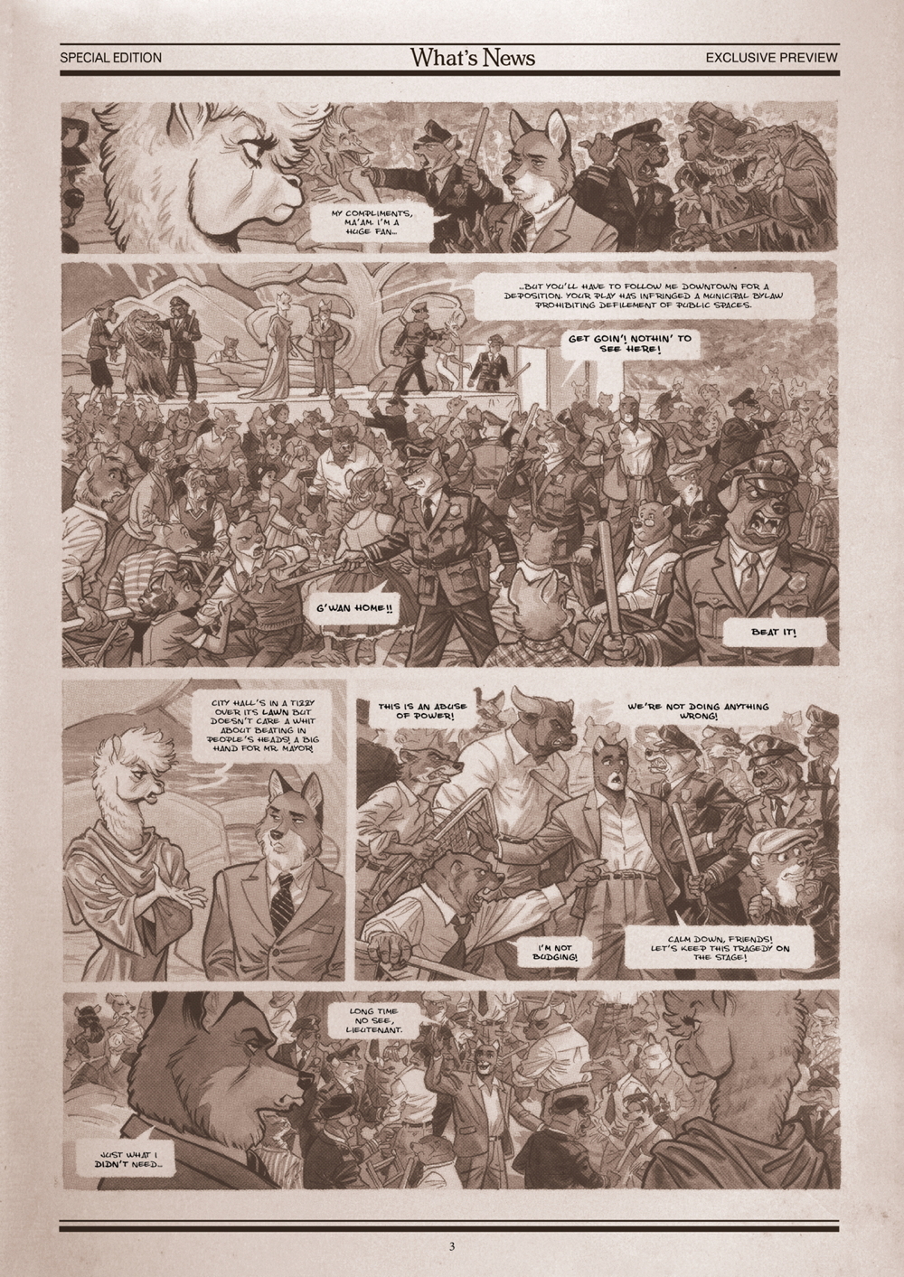Given his recognition around the world, Europe Comics has just released an incredible preview in English. “What’s News” gives not only an inside look at Blacksad’s 20-year history, but a special sepia-toned preview of They All Fall Down. The story finds detective John Blacksad in New York City involved in nefarious goings on with unions, organized crime, and the dark parts of the city, including Solomon, a construction magnate with many plans for the city.