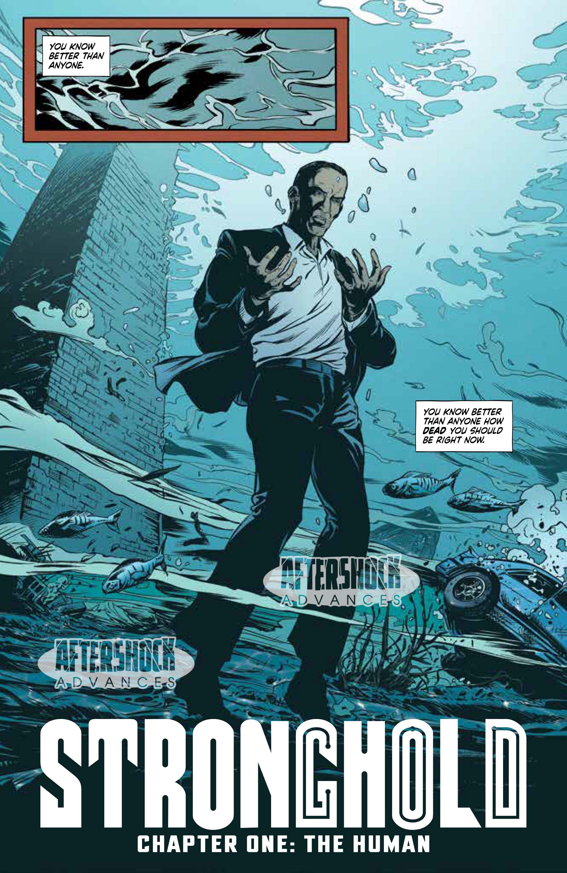 This volume, which collects the first five issues of the series, is largely about all of that, plus what happens when said powerful being starts to regain his identity and control his vast powers. This is, quite simply, an ambitious and singular story that aims for lofty storytelling heights and achieves them. And today The Beat is lucky to have an exclusive preview of Stronghold Vol 1, which is due out from AfterShock on Oct. 2.