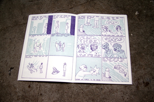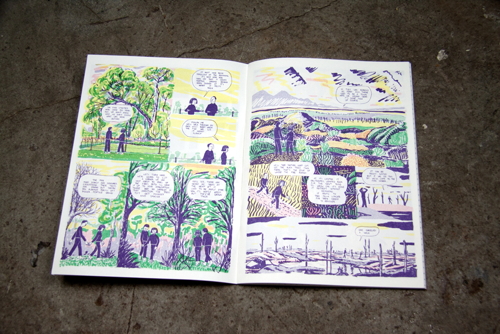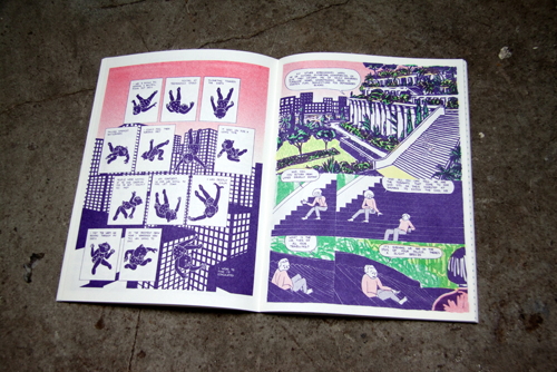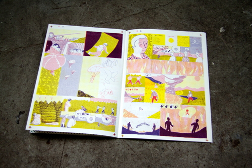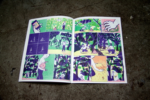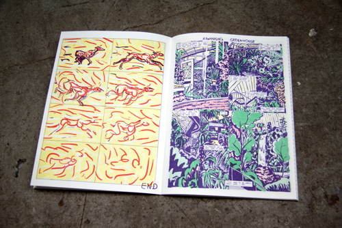 WINDOWPANE is Joe’s first effort into a solo publication, and so far it seems to be an extremely daring take on graphic narrative. The book is composed of seven stories, each of which is subtly related to the last and all of which are linked by a continuing theme of fire. Joe’s use of color echoes notes of a bizarre tropical familiarity, and his attention to depicting high detail along with utter simplicity make WINDOWPANE a unique visual experience. Joe’s artistic sensibilities lay very closely to some of Nobrow’s more experimental artists, such as someone like Blexbolex. His style is aberrant enough to push his book between being highly illustrative and also falling into a more traditional comics medium. As this is his first book, WINDOWPANE showcases a young developing talent; one that will be very interesting to see where it develops from here.