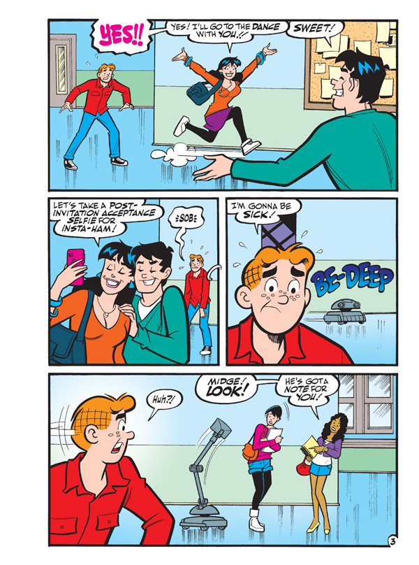 It’s time for the Riverdale High School Winter Dance and Archie needs a date! Unfortunately for him, every girl in school has already been wooed by different guys’ over-the-top ways of asking their dates to the dance! Archie decides he’s going to ask Betty to the dance and he’s going to do it in the biggest, most elaborate way EVER—he’s going to build a giant cake that he can jump out of with his guitar and play Betty a song inviting her to the dance! Will Archie’s pastry plan work, or will his sophisticated scheme have him going stag to the biggest event of the season? Find out in “Take Your Cake and Beat It Too!” the hilarious lead story to this JUMBO-SIZED comics digest!