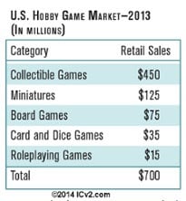 Pop culture experts ICv2 released today the results of their study on the hobby game market and it shows that the North American market totaled $700 million at retail for 2013. Breaking down the estimate for the total industry by category shows that collectible games was the largest at $450 million; miniatures second at $125 million; boardgames were third at $75 million; card and dice games fourth at $35 million; with RPGs coming in last at $15 million. “Hobby games” are defined as those games produced for “gamers”and are most often sold in the hobby channel or game and card specialty stores, but these items are not limited to sales in that market.