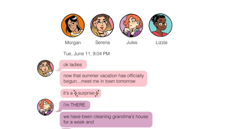 Speaking of Morgan’s friends, they serve to balance out the narrative, and are largely represented in the text through interstitial group chat segments. While Morgan is (most often) included in these convos, as she becomes more embroiled in her romance with Keltie, she is less often a participant.