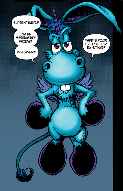 So we have a comic as dark as can be, full of blood, guts, sex and violence (or “violente!” as Happy exclaims). Superbly brought to life by Robertson with slow close ups, fractured panels, and colour – importantly – used as our guide. Splurges of vibrant shades are used to illustrate danger, action and death; the lights on the ambulance, the flare of a gun, the killer about to pounce. All else is subdued, grimy and rather unclear. Until of course Happy bursts through into reality, fresh from the realm of imaginary friends. His bright blue is ridiculous to behold, fitting his absurdly cute appearance, and clashing with the grit of the real world.