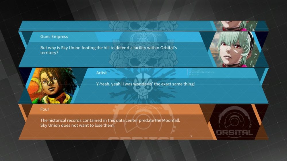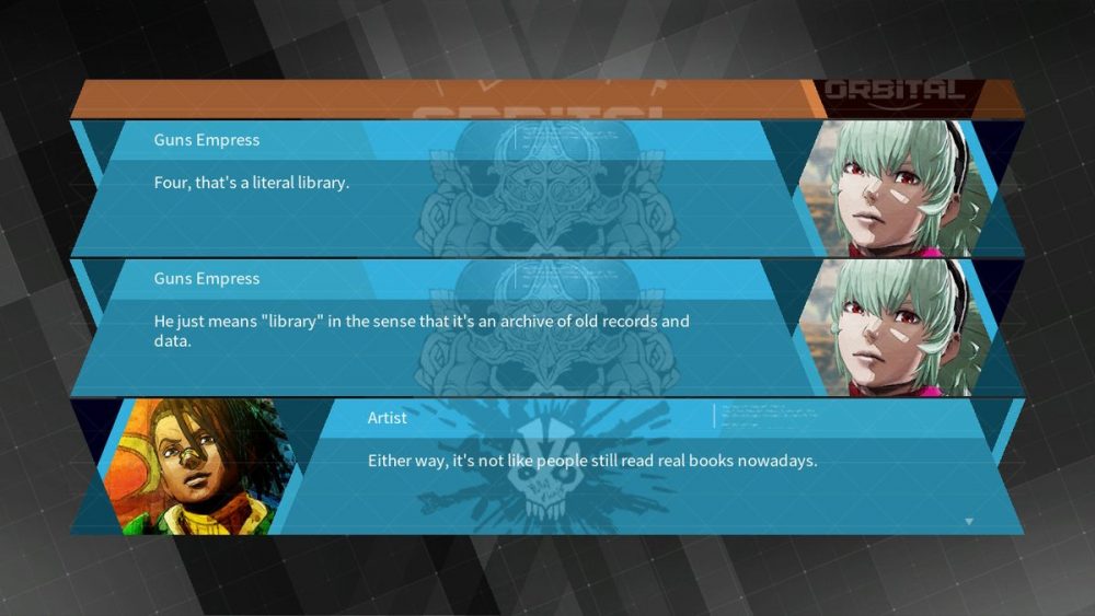 I’d like to add that this is a high future situation on top of what’s described above. Characters offhand mention how books are virtually (no pun intended) unheard of. Additionally, there’s been the present threat of gargantuan mech-like creatures known as Immortals, which corrupt AI systems for their own use. They’re almost Shadow of the Colossus massive and are shown to be difficult to kill. As a mercenary, you’re contracted by the Sky Union with the aid of your AI liaison Four, to dispatch corrupted AI as well as Immortals.