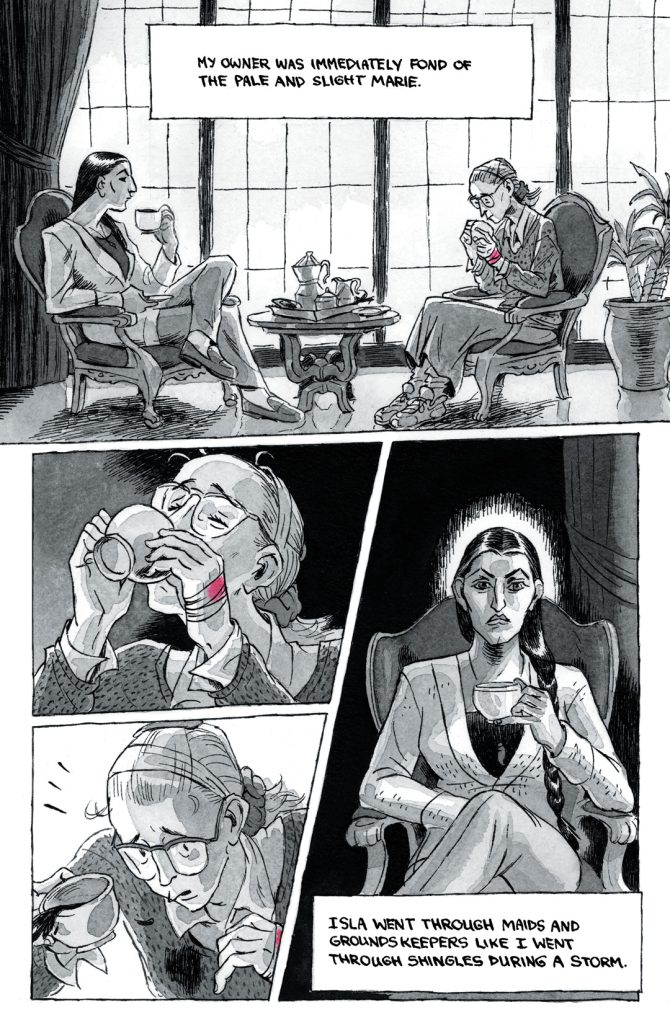 The book’s presented in blacks, greys, and whites with reds occasionally being used to accentuate either specific character moments or terrifying revelations. There’s a particular double-page spread in the book where we can fully appreciate the effects of this color palette in which the angle is pushed way back to get an inside look at the house and the character’s movement through it. A brilliant use of reds to build on one of the character’s perspectives guides the action on the page, gracefully insisting you take your time in each room.