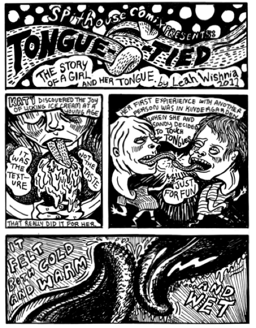 Throughout GUT FEELINGS, Wishnia emphasizes the reality and complexity of sexuality, as her characters explore sexuality in binaries of pleasure and pain, disgust and titillation, enjoyment and shame, all in a productive means to engage how we appropriate gender roles and subjectivity even in a present where the current wave of feminism we are in now is still up in debate. There is a constant morphing and shifting in the roles of her characters, from the perspective of the lusting spectator to the spurned beau, all of which map the psyche of the modern woman. The comic, “Tongue-Tied: The Story of a Girl and her Tongue,” tracks a lived sexuality of discovery and experience through the protagonist, Katy, and her literal organ, the tongue. Like many of her stories, this transformative tale is accomplished through a dreamlike, hallucinogenic envisioning where Katy and her tongue uncover the endless, pleasurable rush of everything from taste, kissing, oral sex, pill-popping, and imminently death. The tongue is presented as its own living entity, a libidinous sex organ separate from the penis or vagina, yet all the while charged with its own individual erotic nature. It’s not so much Katy that exudes eroticism but her tongue, slithering and sweating, becomes its own vehicle of desire. In fact, it’s the panel that singularly features two tongues that could be deemed the most pornographic: two slopping, dripping black masses grind upon each other surrounded by the text, “It felt both cold and warm…and wet.” In this panel, Wishnia is demystifying the gender-controlled association of intimacy and sex by explicitly highlighting the urchin-esque and sensual tongue in carnal revelation rather than the copulation between two subjective bodies. The tongue, indecipherably not gender-specific and non-reproductive, is the fundamentally significant star of the comic, living on even as its owner dies and thus invading preconceived notions of sexuality. The self-reflexive playfulness of “Tongue -Tied” is a creative means of expressing the materiality of gender beyond sexual distinction.