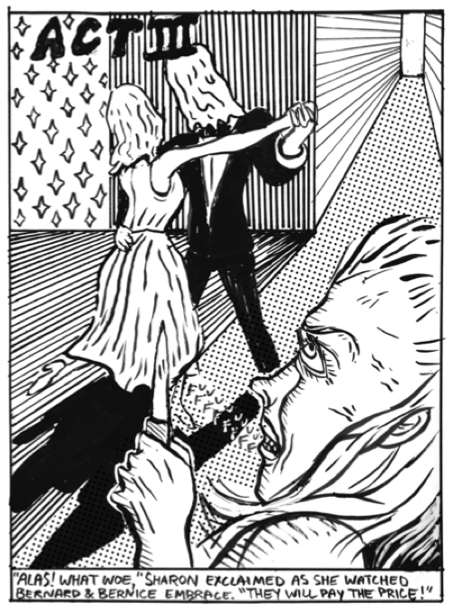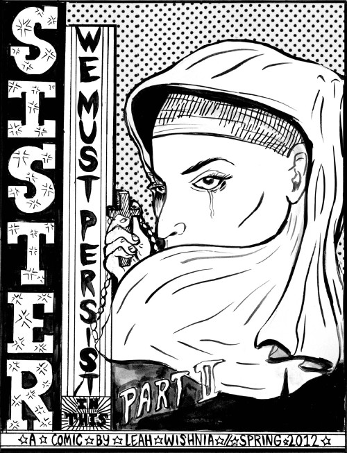 Religion has a strong, reverberating presence amidst the pieces in GUT FEELINGS, most notably with the three parter “Sister We Must Persist In This.” Wishnia herself was raised with both conservative Catholic and culturally Jewish communist influence, and it’s made clear early on that she enjoys presenting a comically dark caricature of the religious system. When Suzie Blister walks in on her boyfriend, Daniel, in bed with Kyla Klaptrap (Wishnia also has a witty knack for naming), she is overcome with anguish and accidentally collides with a vehicle that places her into a comatose state. In the hospital, she is approached by the Virgin Mary who awakens her with the milk of her breast, the nipple discharging a baptismal deluge of liquid, christening Suzie. Wishnia manifests her opposing religious sentiments by conceptualizing an empowered sanction of women who worship the Holy Mother and God as woman, as Suzie, who becomes an apostle, explains, “And it was then that I finally saw THE TRUTH! That God made Mary in her likeness, who then passed that power down onto Jesus, Mary’s son.” Evoking the bizarre, nightmarish hallucinations of Justin Green’s seminal “Binky Brown Meets the Holy Virgin Mary,” Wishnia reprocesses her own experience by visualizing religion as an iconoclastic, feminist-oriented, and liberated assembly while maintaining the same iconic imagery. While the nuns are in true classic habit, they are resolute in their opposition to the institutions of Christian patriarchy, explicitly omitting the existence of male authority with a fervid refusal of the dogmatic generational inheritance of the family tree. The original Hail Mary prayer is irreverently transformed to “Hail Mary, full of grace. Our lady is with you. Blessed are you among women, and blessed is the fruit of thy spirit, Mary.” The apostles are unlike the meek and genial stereotype of nuns, alternatively they are expressive and unflinching, a stunningly rapturous congregation paralleling Paradise Island’s Amazons. They encompass the merry beach babes dressed in tiny bikinis as well as the nebulous cloaked-clad inexorable disciples of the church. The vixen-like stare is captured on the cover page of part 2, an alluringly magnetic image that could shine all on its own, and much like Wishnia’s other renderings of women, pressures how we perceive women that shatter the mold of “correct” female roles.