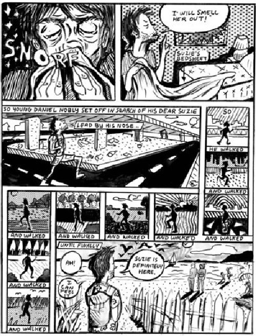 “Sister We Must Persist In This” moreover displays Wishnia’s experimentation with layout strategies, as part two features a delineative variation of panel shapes and sizes, from the full page spread of the cover to the more cinematic wide composition, all the while littered with compressed, granular panels, one segment being the mirage of a blacked-out silhouette of Daniel in search of Suzie, captioned by a repeated “and walked,” as he passes to the unrevealed gateway to the temple of Mary’s apostles. The fluctuating landscape positioned behind a stagnant Daniel could be simply read as a sequential means to denote the passing of time, but it’s interesting how Wishnia attributes very little detail to Daniel’s movement yet paints such a vibrancy for the females. The only moments when Daniel is given an insurmountable amount of detail is when he is caught in hysteria—only then is he portrayed with an abundance of expressive furrowed facial lines, emitting sweat and tears for his lost Suzie.