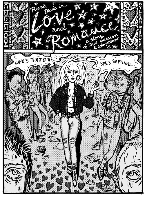 GUT FEELINGS chronologically lays out the evolution of Wishnia’s style, beginning with 2008’s “1001 Wives” to her most recent work “Don’t Stop Don’t Stop Don’t Stop,” originally exhibited at San Francisco’s Double Punch Gallery earlier this year. The scope of the visual experiments she delves into is much better appreciated with a curated collection like this, as we can track her formative scribbly yet meticulous penwork and densely crowded inking to the stylized protopunk design that she is more rooted in today. What remains consistent is the amount of detail she embraces in her backgrounds. Every panel is chock full of textures and patterns, with densely layered cross-hatching and engraving-like fibers running rampant over the page. A noticeable development is Wishnia’s altered rendering of her characters’ faces: the almost tortured scratchiness of Lori in “1001 Wives” becomes more defined, there is less of an erratic temper to her line, and in a piece like “Love and Romance,” the lines are smoothed out and pronounced, still as fierce yet now more capable of synthesizing the distorted, shapeshifting nature of her characters.