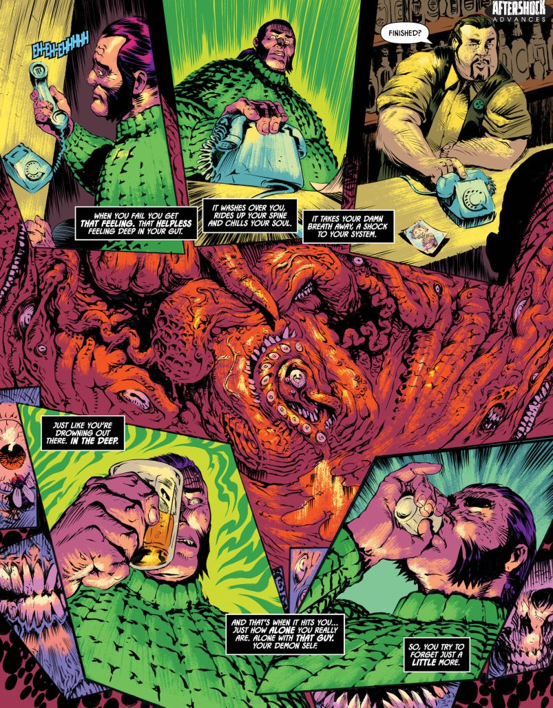 Fatally flawed characters, most especially the protagonist. Check. Dirty deeds acted out covertly and compelled by the darkest human emotions. Check. Plenty of violence, including an industry based on choreographed gladiatorial events. Check. An ending with nothing gained after much ventured, and a grappler sprawled on a canvas apron littered with broken dreams. Check. The wrestler as a soul damned by his own anger issues, his own ego, and navigating his own downward spiral of vicious cycles. Check. The solicits asked if Wrestling Noir was a real genre, and after reading AfterShock’s Hell Is a Squared Circle, you’ll be convinced that, if it’s not, it isn’t for this creative team’s lack of trying.
