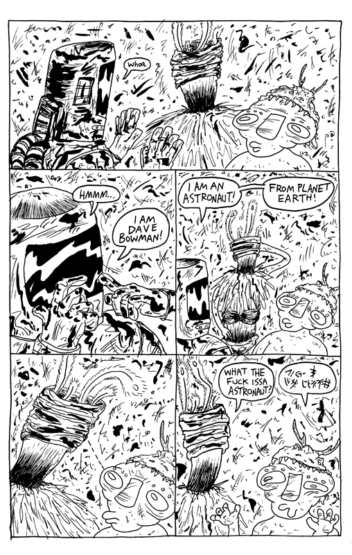 Infinite Bowman is interesting in many regards. First in its combination of various sci-fi elements from cinema and comics. The iconography of Stanley Kubrick’s 2001: A Space Odyssey, Jack Kirby’s entire sci-fi work, Jim Davis, Matt Groening and many more is absorbed and repurposed to tell the story of a sad man over thousands of years. Aulisio innovation in this comic is the integration of stoner comedy. He appears to be quite fascinated with that type of humour; that became quite apparent when he published comics under the Yeah Dude Comics Press back in 2013-2014 (I had reviewed some of them back on my old, now defunct blog. Some of those titles were very good, some were lacking). Now I’m not usually a big fan of this type of humour, but Aulisio is able to use these comedic tropes to great effect. The trippy voyage of Bowman through the monolith is replaced by a bad drug trip with aliens. It is lowering the cultural cachet of Kubrick’s revered classic to a Cheech & Chong farce. Aulisio manages to lower the cultural status of his highbrow references to put it on a playing field with the rest of the lowbrow elements at play and somehow, it elevates them all. Mixing stoner comedy with Kubrick and Kirby shouldn’t work, but it manages to stay reverential to the trippy nature of these original works while adding a layer of humour on top of it all.