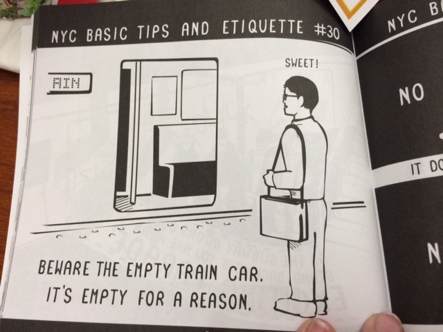 I kept expecting this book of cartoon tips to be funny and it wasn’t. Then I realized it wasn’t meant to be funny. It was meant to be what the title says: tips and etiquette, like how to order pizza and how not to hang on the subway pole (I admit I do that because I don’t like touching its mega-germy surface), avoiding garbage and similar pieces of wisdom. Most of these tips—like the smelly garbage one—would be germane in 50% of the places on earth, but there is the occasional nugget like the Horror Of The Empty Subway Car (usually involves two or more of the following: a bum, puke, piss, poo.)