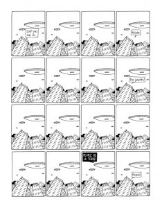 The premise is silly and, while a thoughtful analysis of art in society permeates the book, there are plenty of gags to keep the book light and breezy. There’s a recurring gag about how tiring it becomes to constantly listen to the same music, over and over again. Once the artists have been abducted, a couple back on earth complains about the lack of new music. They are stuck endlessly listening to old CCR albums without any new material in sight. They just don’t know of anything else so CCR hits are on repeat until something better comes along, but the artists are gone, so nothing new will ever come.