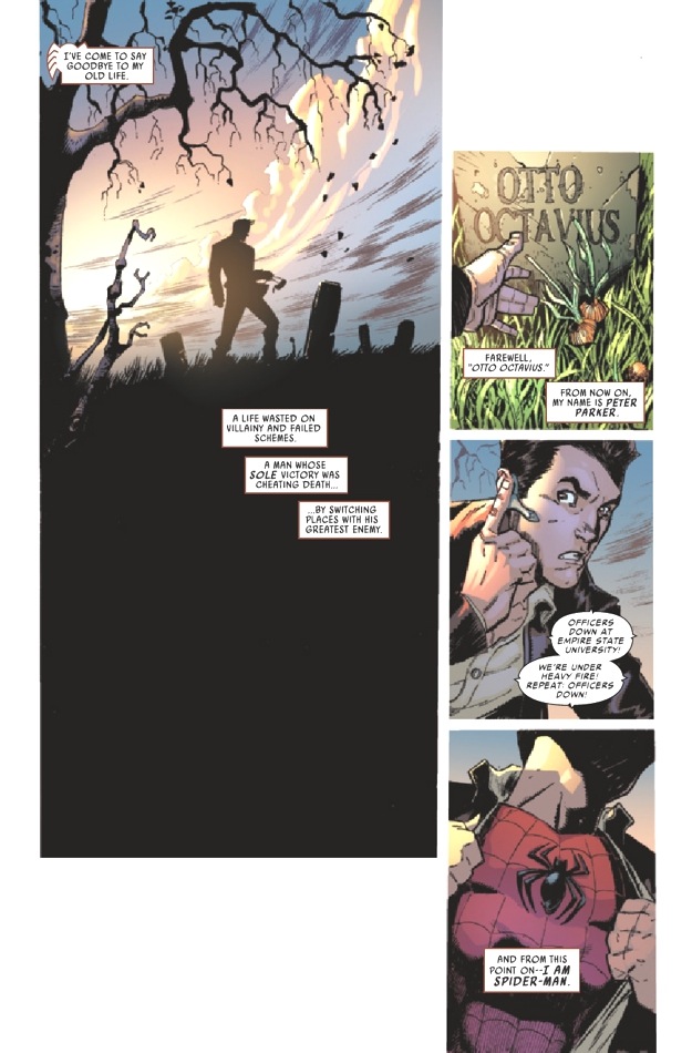 Bravo to Dan Slott for not leaving us with the first possibility: a Doc Ock converted by a warm and cozy environment in which he can blossom into a do-gooder, or ever with the second possibility: that a supervillain makes a pretty successful superhero under the right conditions, in favor of a rather human truth. It all comes down to the mantra of Spider-Man mythology. With great power comes great responsibility. Otto comes so close you can almost root for him, but in the end, he can’t handle the power. He tries to kill Boomerang, and make an example of him on live media stream. If you thought the death of Peter Parker was the big story in Spidey mythology, this might have been one step further: Spider-Man murdering a pleading man on live TV. That would have been the death of Spider-Man in many ways, and no amount of taking over Parker’s body could have resurrected Spider-Man in the SS storyline. The reader is meant to be thoroughly unimpressed by Otto/Spidey’s attempt to kill Boomerang in gritty, repeating panels of pummeling and blood-spatter. Just to make sure, Boomerang gets to plead for his life. If, at this point, Otto/Spidey relented, you might be confused enough to reconsider the former possibilities, that he’s been converted to being a hero, that he just needs time to adjust. It’s much, much more interesting and satisfying that the specter of Peter Parker himself stops Otto/Spidey from this act, preserving open conflict and keeping the story- you guessed it- confusing.