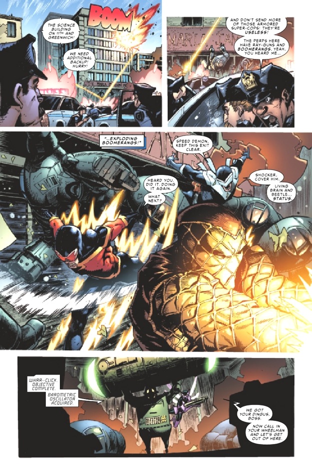 Some other impressive qualities that Otto/Spidey displays are doing things that Peter/Spidey never would have done for moral reasons or simply would never thought of doing. He gleans insider information on the Sinister Six’s plans by scratching Boomerang and injecting him with nano transmitters. But this is around the point where things start to get confusing. Otto/Spidey finding himself outnumbered and at the hands of superior weapons tech decides to take off and protect himself, a retreat. That’s unlike Peter/Spidey but you could attribute this to a former villain’s self-serving attitude. Something happens to interfere with this escape, a sudden and rather selfless attempt to save the life of a police officer. At this point, even Otto/Spidey comments, “Why on earth did I do that?”. Is the hero role, a combination of situational factors, shaping Otto into a better person already?