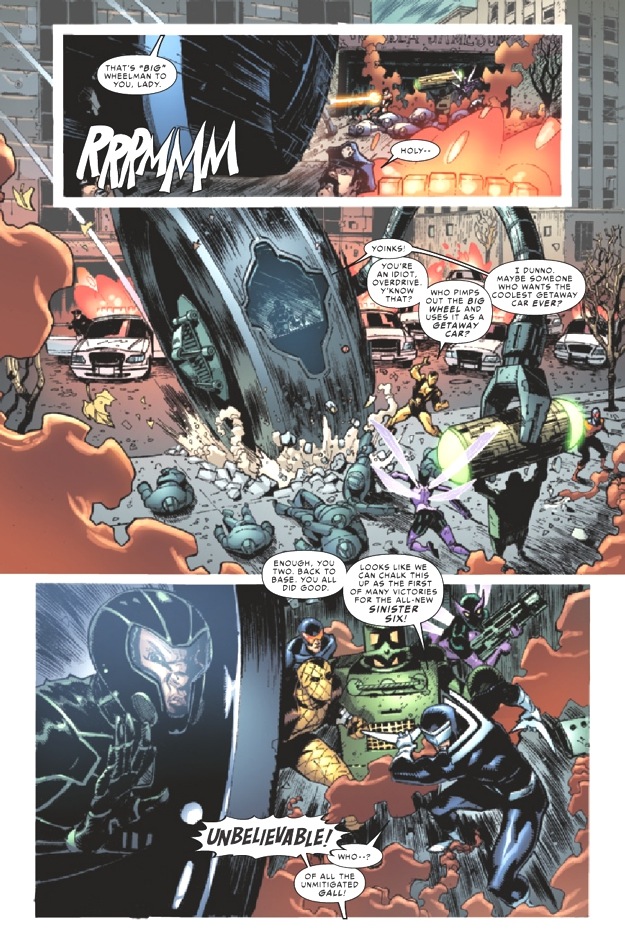 When a new “Sinister Six” team unleash some devastation and Otto/Peter rushes into action as Spider-Man, you do get a twinge of the unfamiliar. A former villain fighting a team of villains: that’s the beginning of a good story. It’s logical, but not predictable, that Otto/Peter now knows far more than Peter alone knew about the strengths and weaknesses of said villains, and seeing him rip apart a large team of tech-heavy villains by using that knowledge is very satisfying. Spider-Man’s known for his quips, and rather than hearing any same-old insults, readers get a new spin. Otto/Spidey is disgusted by the ineptitude of his foes and their “gall”. That “superior” attitude is pretty refreshing. You begin to see the features of Otto’s personality and knowledge that are actually helpful in a violent conflict, features that might even trump Parker’s natural instincts or qualities. Otto/Spidey’s steely confidence is the most impressive quality, one that serves him well.