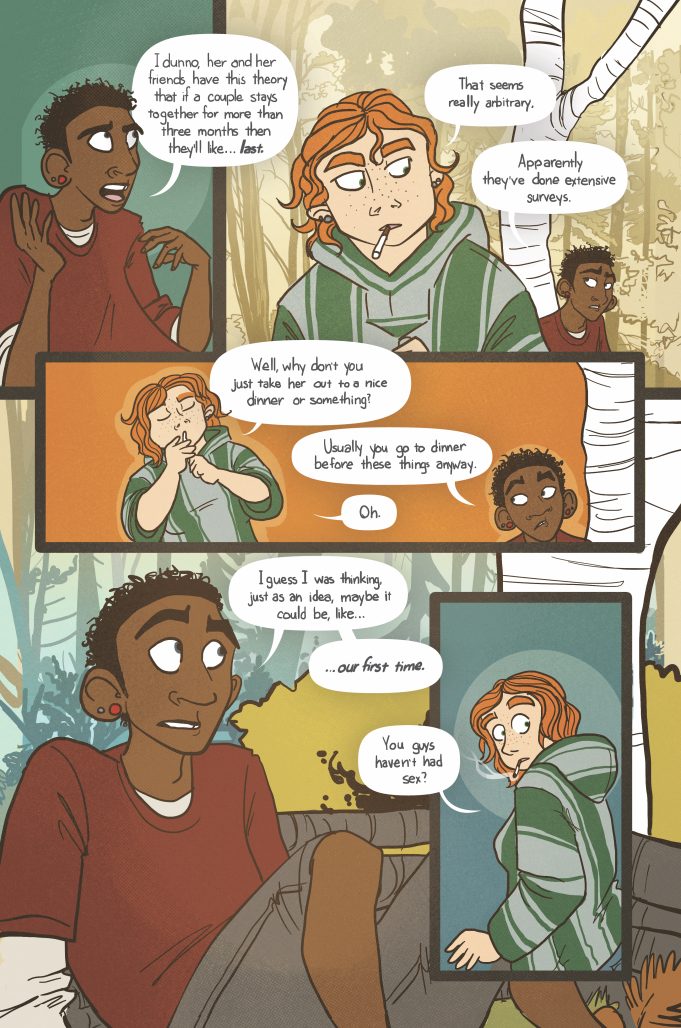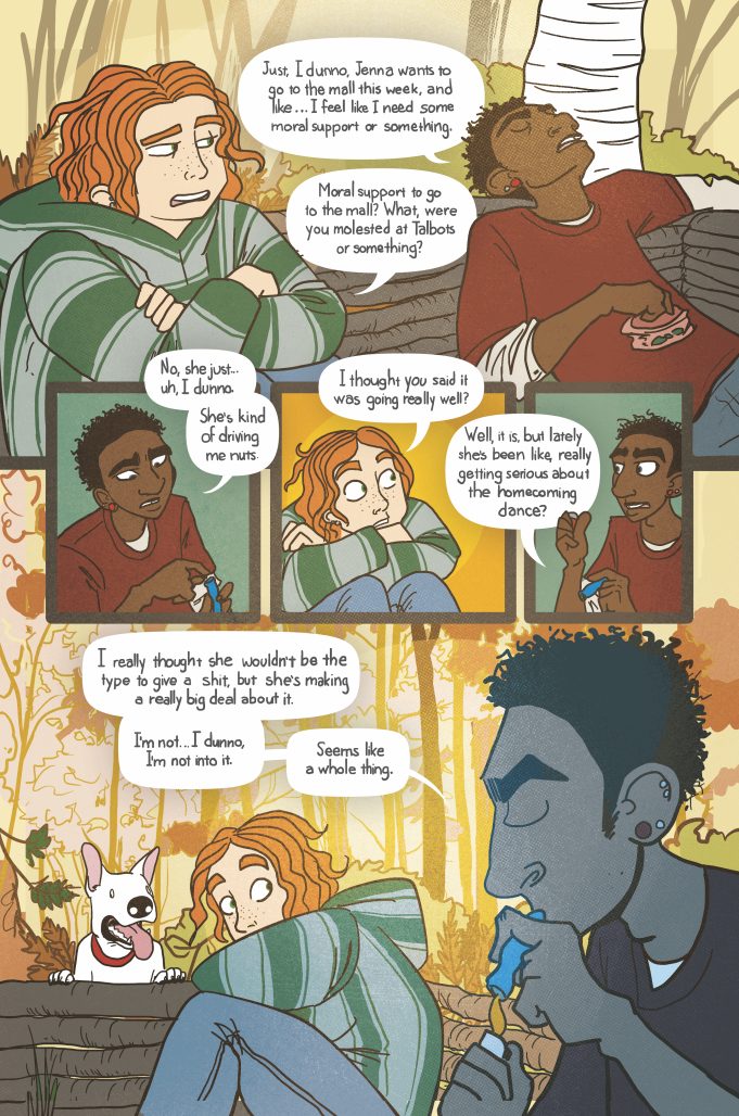 “When you’re young, you have so little control over your own life — you are subject to the whims of your parents or guardians, which is not always a bad thing if they truly have your best interests at heart, but unfortunately that’s not the case for all kids,” said cartoonist S.E. Case. “Part of being a teenager is trying to figure out who you are, and that’s hard — but even harder when those around you cannot accept who you discover yourself to be. Will anyone recognize your value as a person when your goal is not to make the football team, or get into a prestigious college, or be crowned homecoming queen, but to simply get through the experience of being a teenager relatively unscathed? Maybe smoking weed in the woods and stealing sunglasses from the mall aren’t the most productive coping mechanisms, but what else is a disaffected 16-year-old in a rural town to do?”