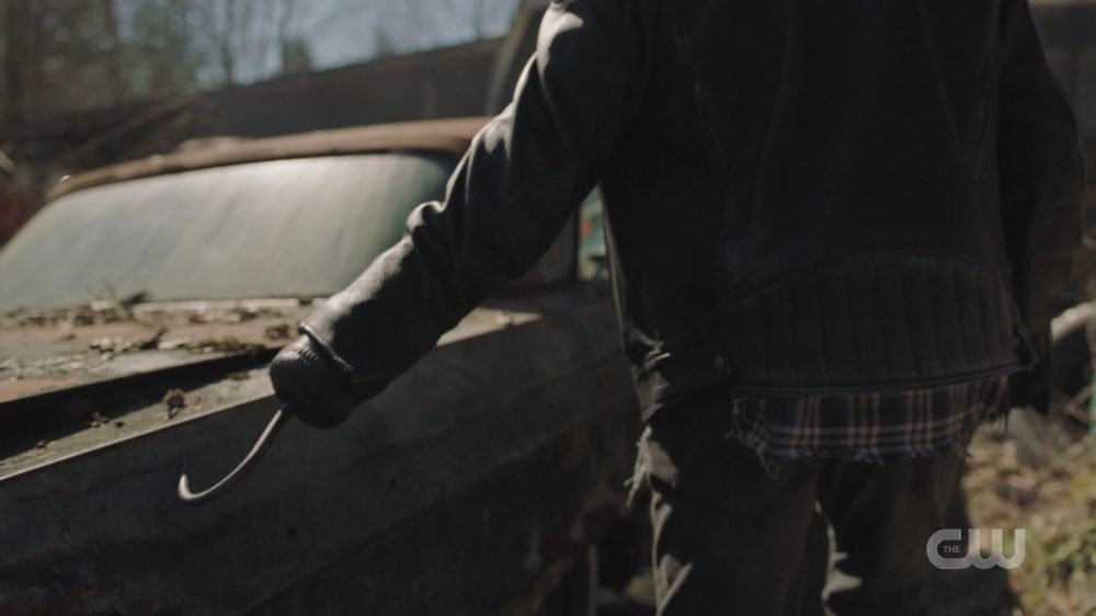 Ethel leads Jughead to the bus. Jack is there. But before they can get off the bus, they spot The Black Hood outside! He drags his hook along the outside of the bus and bangs on the bus’s hood. The Black Hood enters the bus. They try to escape out the back door, but it’s stuck. Jughead kicks it open and blocks it with some junk to keep the Black Hood from following. Jughead sprints to the front and blocks that door too. The Black Hood rages at being trapped on the bus. Is it me or does it seem like there are about 30 other ways out of that bus? Come on, Hal! You just fled from a bus, this should be easy! …if that is you under the hood.
