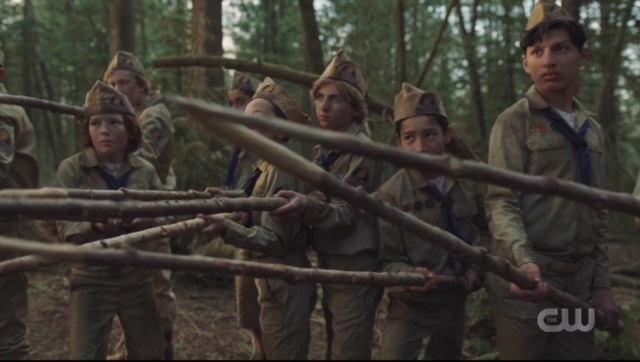 Out in the woods, Jughead breaks up Ricky’s ascension. He tells Ricky he’s going to save him, but Ricky doesn’t want saving, he wants ascending. Ricky is speaking in the plural, talking in “we” instead of “I.” When Jughead questions that, a bunch of junior scouts emerge holding spears, and chase down Jughead Lord of the Flies style. Jughead runs and drops down the hatch Lost style. Waiting for him in the hatch is Ethel, who tells him, “Help me Jughead Jones, you’re my only hope.”