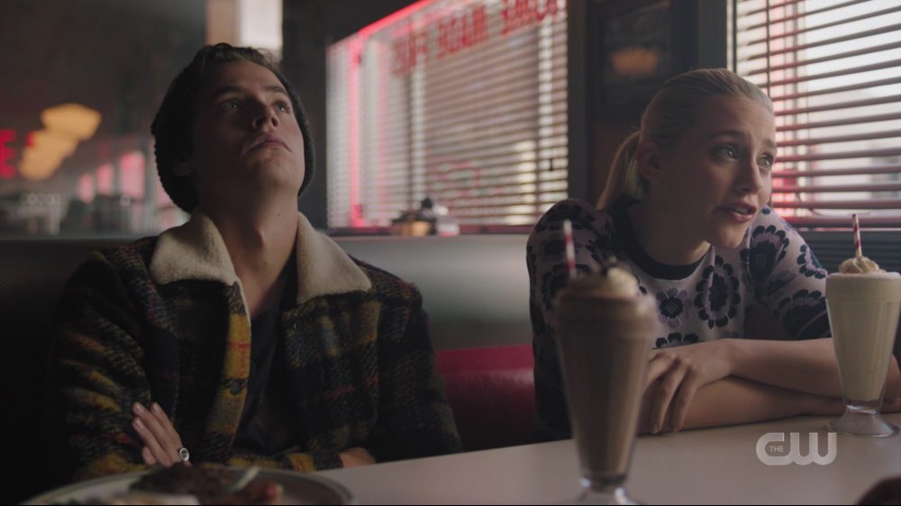 Jughead asks about Kurtz at the Maple Club. He’s following up on Kurtz having a Maple Club matchbook lodged in his throat when he died. The lady of the night on duty (the lady of the night duty?) tells Jughead that Kurtz only ever visited Penelope when he came by. She also casually says that Penelope’s son Jason comes around all the time too. Is this girl new to town? She wouldn’t be freaked out by the most famous town corpse paying a visit at her office? I get it; there are a lot of corpses in Riverdale and it’s hard to keep track of who’s dead and who’s alive. But still.