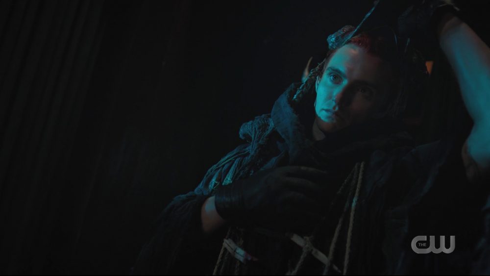 Jughead’s quest is a battle of kings. It’s Gargoyle Chic vs Jughead. They race for a ax. Chic gets to it first. Jughead wants answers as he evades the ax. Why is Chic doing this? His answer is basically, “Because I’m a crazy psychopath. Hi, did you meet me last season?” Chic loses the ax but quickly regains the upper hand and starts choking Jughead to death. But Jughead reaches for a big horn and bludgeons Chic with it. Then Jughead puts his hat back on all badass style. Wait, when did he take it off? Do I rewind for this? (I don’t).