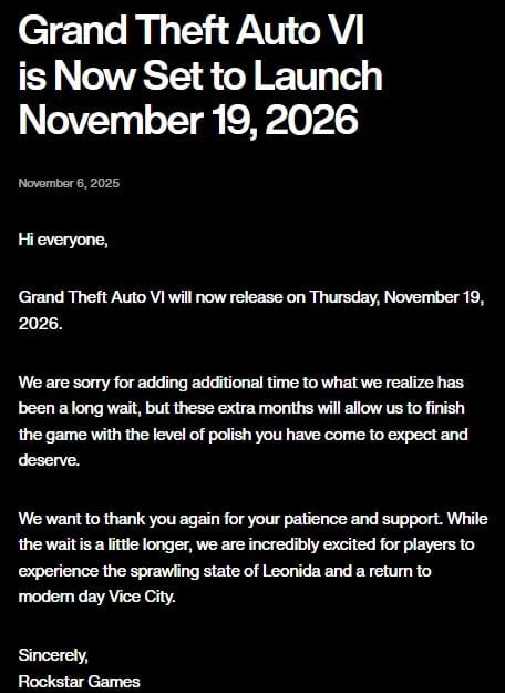 After announcing a delay, Rockstar has moved the release date of Grand Theft Auto 6 to November 2026.