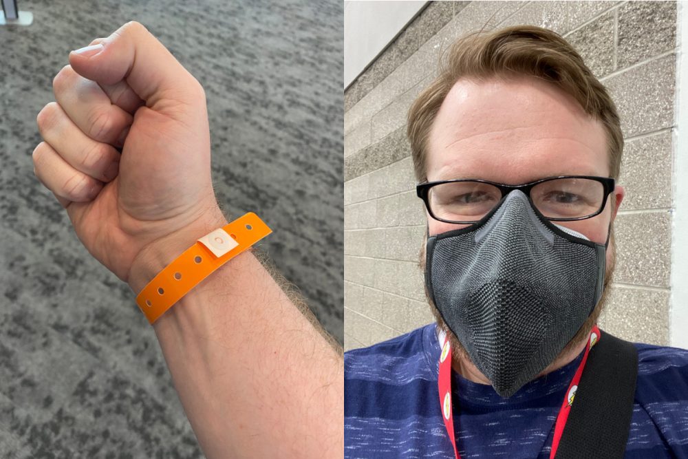 In addition to being fully vaccinated, I took a few extra precautions for myself, double-masking with both a strapless, disposable KN95 mask and another, slightly more comfortable, filtered mask to hold it in place, and carrying a large bottle of hand sanitizer in my over-the-shoulder bag to use after touching pretty much anything. I also took extra Vitamin C starting a day before the con, and multiple times a day during the con itself.