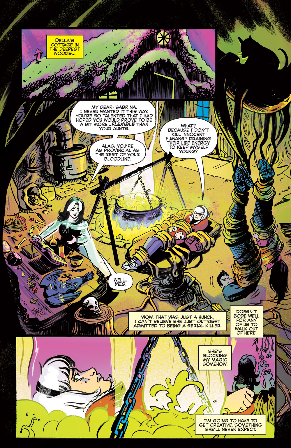 Next Wednesday sees the release of Sabrina: Something Wicked #5. The final issue of the latest Sabrina, the Teenage Witch series by Kelly Thompson, Veronica Fish, Andy Fish, and Jack Morelli finds our heroine at the mercy of the magical serial killer she’s been tracking since the series began. With her magic blocked, Sabrina will have to depend on her friends to help her escape and stop the killer before she can strike again.