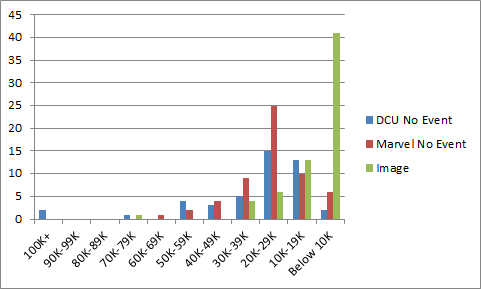 On the surface, that’s not a horrible chart. Multiple titles over 100 – from DC _and_ Marvel both. While the 90Ks sales band is empty, there’s at least one issue in every other band. The 70Ks and 60Ks aren’t bare. Still way too high a percentage of the total market is selling under 30K copies though.