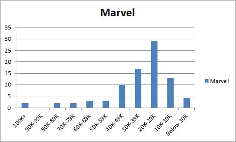 If you look at the big picture, Marvel needs to get some more breakout hits and lighten up on the low sellers. The bulk of Marvel’s titles are still under 30K. That’s not great.