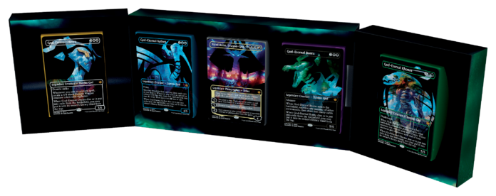 While all the cards included inĀ Dragon‘s Endgame were previously released in theĀ War of the Spark expansion, you’ve never seen them look like this before. The SDCC exclusive set features the God-Eternal cards, including Oketra, Rhonas, Bontu, and Kefnet, and Nicol Bolas, Dragon-God, with a brand new artistic treatment by Adam Paquette. Rather than showcasing their full and powerful forms, we see the God-Eternals’ and Bolas’ silhouettes filled in with scenes of Ravnica at war. Small details like the Parhelion II forming God-Eternal Oketra’s furrowed brow and a stolen Planeswalker spark forming Bontu’s eye add dimensionality to the cards and will delight long-time fans of the game.