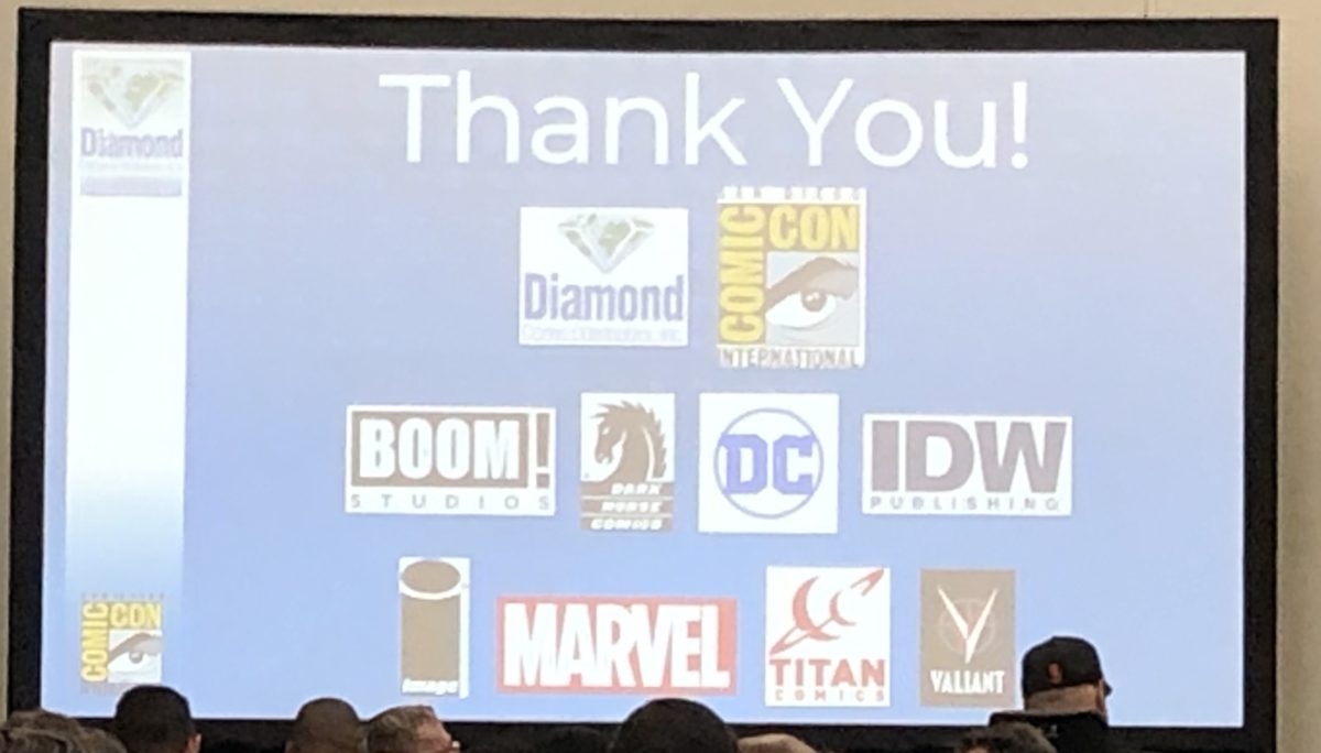 Comic shop owners and orderers gathered at San Diego Comic-Con on Friday for the annual SDCC retailer lunch. The session featured presentations from Diamond Comics Distributors, as well as sponsoring publishers Marvel, Valiant, Image, Boom!, Titan, DC, IDW, and Dark Horse Comics. Over the course of two-and-a-half hours, the presenters outlined new initiatives and projects that will be rolling out for retailers in the coming months.