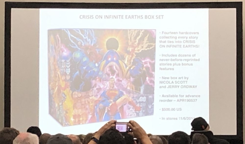 - The box cover art for the massive Crisis on Infinite Earths hardcover box set was revealed. Artists Nicola Scott and Jerry Ordway provided the cover art. FOC for this set has passed already, but DC has produced a healthy amount of the set, which includes a lot of material that has never been reprinted.