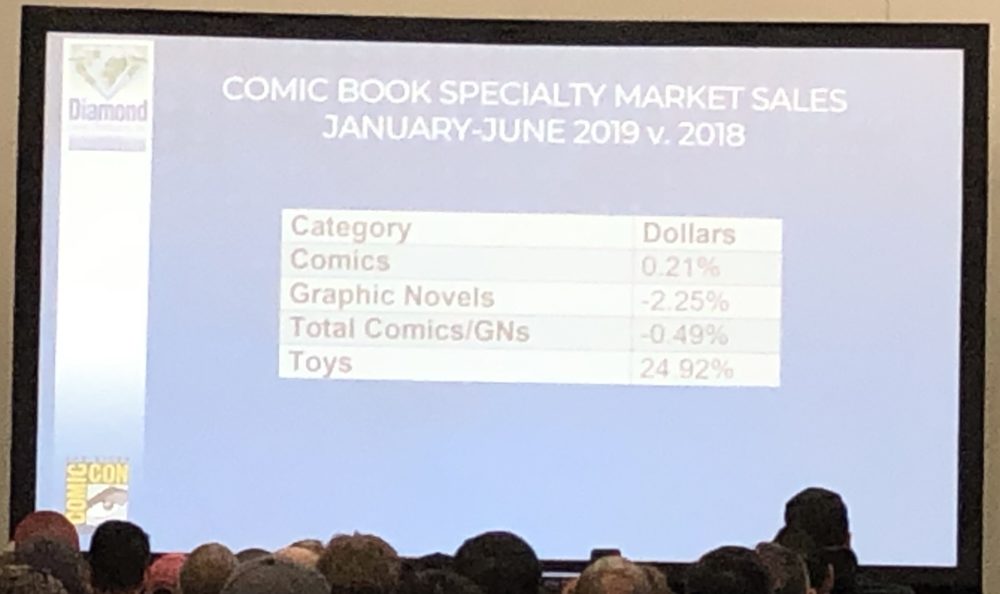 The Diamond presentation began with a chart that illustrated the relative flatness of the market. The holiday shipping schedule was also reiterated, with no skip week for Christmas. Books releasing on Thursday, 12/26, will be sent to retailers the previous week, while the first new release date for 2020 will be January 1st.