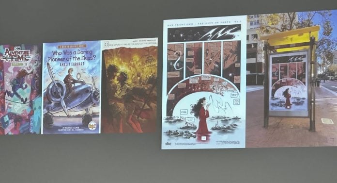 As the first comic art professor at Berkeley, they just bring their passion for this medium, and show up for their students as much as they can. Esguerra (they/them) is also a science fiction writer, whose debut graphic novel, Eighty Days, is an epic set in an alternate universe of Earth in the 1930s, and populated with queer characters. “I wasn’t interested in telling the same old story about a sad straight white man,” they joked. “I wanted to do one about a sad gay Asian one!” Inspired by a mix of Ghibli and Casablanca, they were drawn to the drama of the era. They also showed the panel a comics page where they came out as non-binary, admitting they worked through the experience on the page.