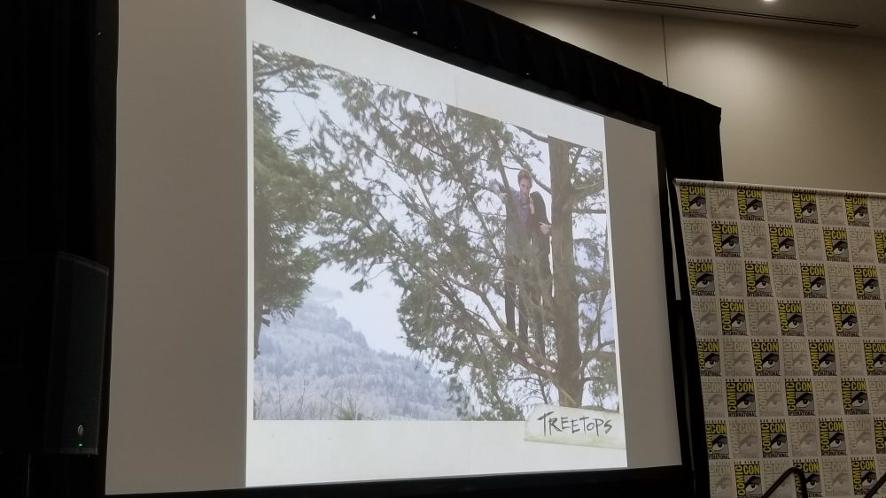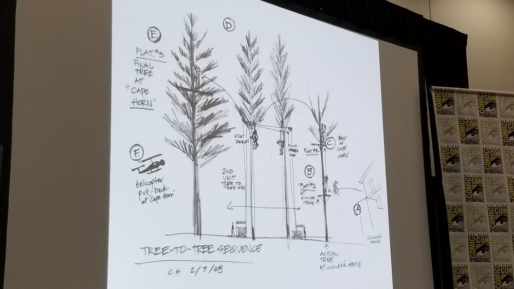 Filmed on the Columbia River Gorge, the sequence was done with few greenscreens and visual FX. During the panel, Hardwicke and Matt attempted to show the sequence… but the sound didn’t work. The audience didn’t mind and they managed to speak aloud every line that should have been heard. Especially the immortal line, “Hang on, Spider Monkey.”
