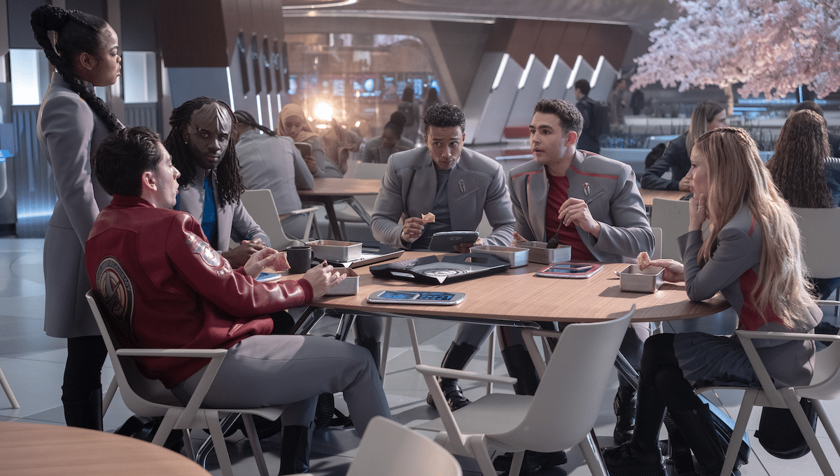 Among the information shared about Starfleet Academy were preliminary details about the characters played by the actors onstage. Hunter is playing Captain Nahla Ake, a character who is part Lanthanite. Rosta plays Caleb Mir, a human cadet with an enigmatic and troubled past. Diané plays Jay-Den Kraag, a Klingon cadet. As Diané revealed, both Michael Dorn (Star Trek: The Next Generation, Star Trek: Deep Space Nine, The Next Generation movies and Star Trek: Picard) and Doug Jones (Star Trek: Discovery) shared advice for the performance.