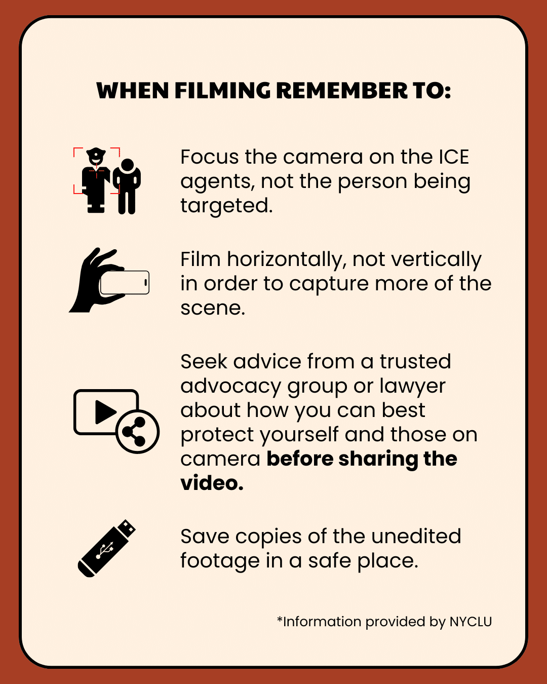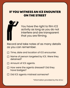 - Film the encounter – you have the right to film ICE activity as long as you do not interfere and do not hide your phone or recording device.