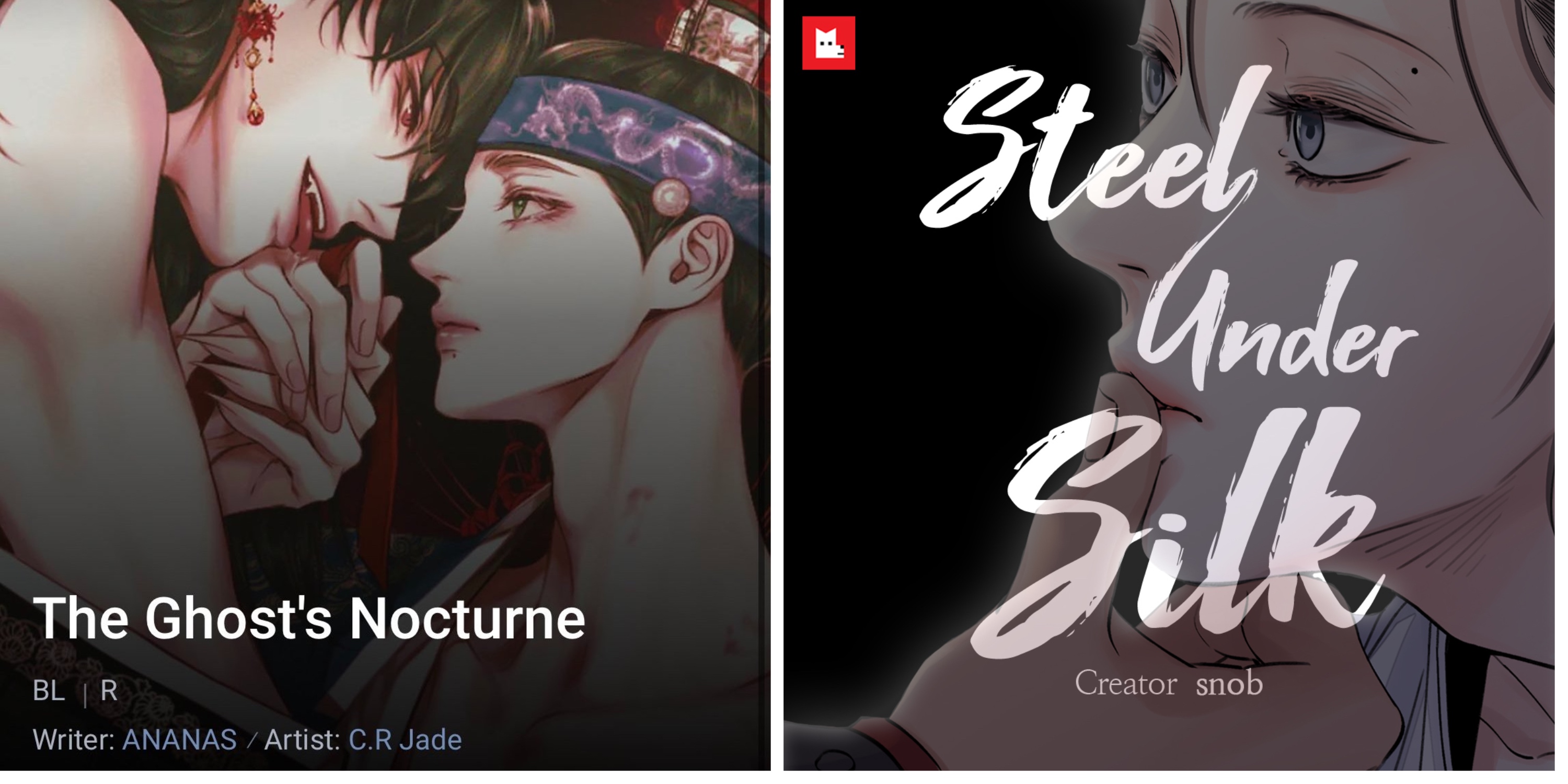 KRISTINA ELYSE BUTKE: Every Saturday and Sunday I look forward to Lezhin’s mature BL webcomic releases. On Saturdays I dive into Steel Under Silk by snob. It’s a historical BL about a young man whose family was massacred and his vow for revenge by becoming the lover of the man responsible. On Sundays I read The Ghost’s Nocturne by ANANAS and C.R. Jade. It’s a historical fantasy about the son of the King of the Underworld who gets expelled and the only way he can return home is to win a human’s love. Both manhwa have me glued to the screen and I can’t wait to see what happens next.