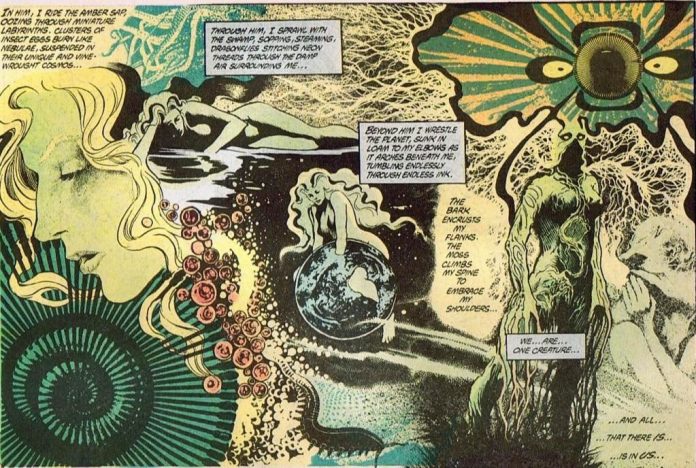 There’s no question that what follows is essentially a sex scene, but upon first glance, one wouldn’t recognize it as anything so literal. In fact, most questions about how the mechanics of sex between a human woman and plant man would work are left blessedly ambiguous. Even Abby may not have been fully aware of how they “did it,” as their foreplay starts with Swamp Thing offering her a gourd, imbued with mysterious psychedelic properties, that he grew from his chest. After eating it, she didn’t just have sex. She had the wildest trip of her life.