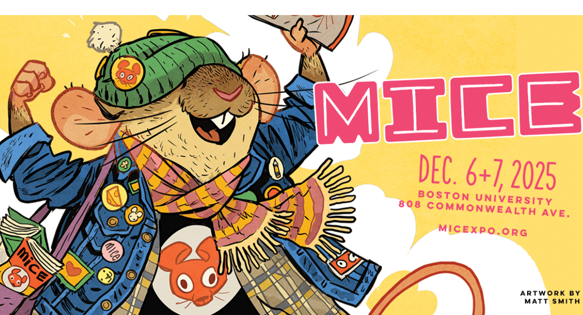 The MICE main event will take place Saturday and Sunday, December 6th and 7th, at Boston University’s Fuller Building, 808 Commonwealth Avenue, Brookline. A post-show presentation by McCloud and Telgemeier will be held on Sunday, December 7th, from 5 pm to 7 pm at the Tsai Performance Center, 685 Commonwealth Ave, Boston.