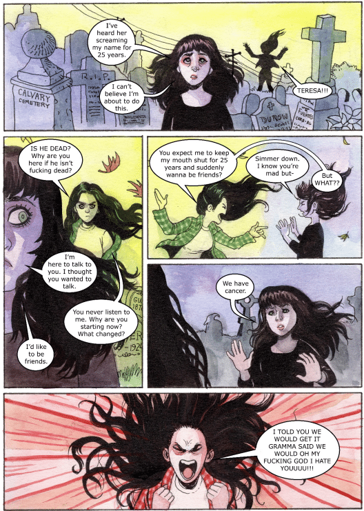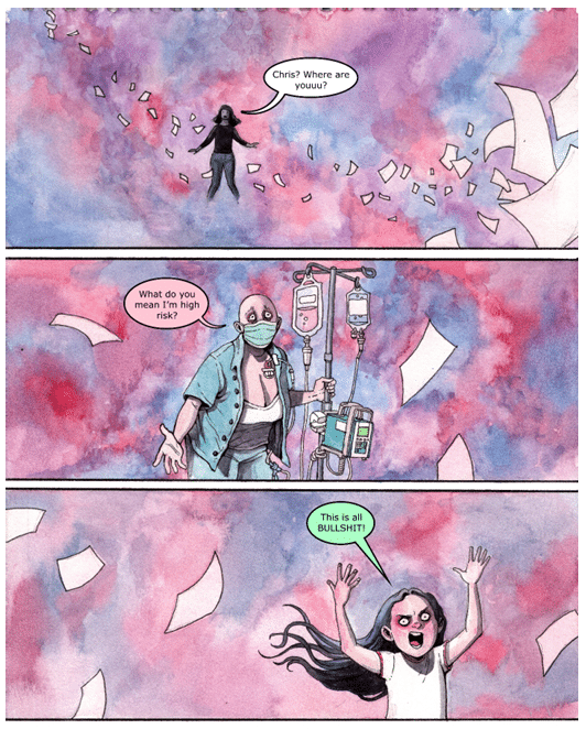 She writes about cancer, but it’s not just cancer, because nothing in our lives happens in a vacuum. There are the parts of us that were yelled at and traumatized and let down that we carry with us. There are parts of us that are ashamed at the lengths we went to in order to be loved and supported. These truths are depicted in a dreamy watercolor and pen work that fits the almost stream-of-consciousness structure of the book.