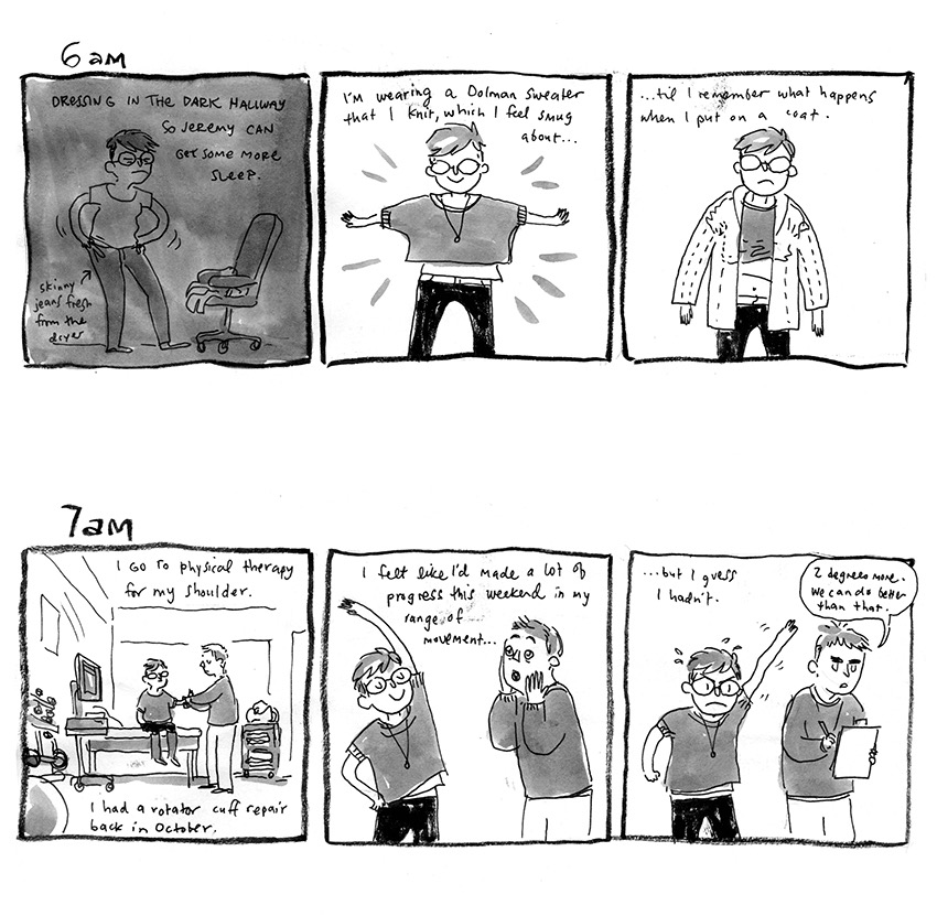 Monday, February 1 was Hourly Comic Day, where cartoonists challenge themselves to draw comics every…hour. The results are quotidian and charming slices of lives from around the world. The idea is credited to John Campbell (Pictures for Sad Children) and started back in 2006. Now some of the best cartoonists do them. Alex Jones already gave us an update during the excitement of the day itself but here’s a wrap-up round up, and to no one’s surprise, cats and coffee are recurring themes. Also, a lot of cartoonists get up at ungodly early hours!
