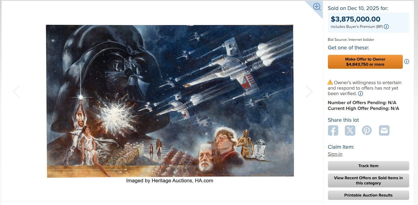 Tom Jung‘s iconic Star Wars “A New Hope” painting was sold by Heritage Auctions last Wednesday for $3.875 million. The artwork was used as key art for the half-sheet poster that appeared in newspapers, magazine ads, and billboard advertisements in 1977 during the original release of the film. This was, for many Americans, their first look at the Star Wars franchise.