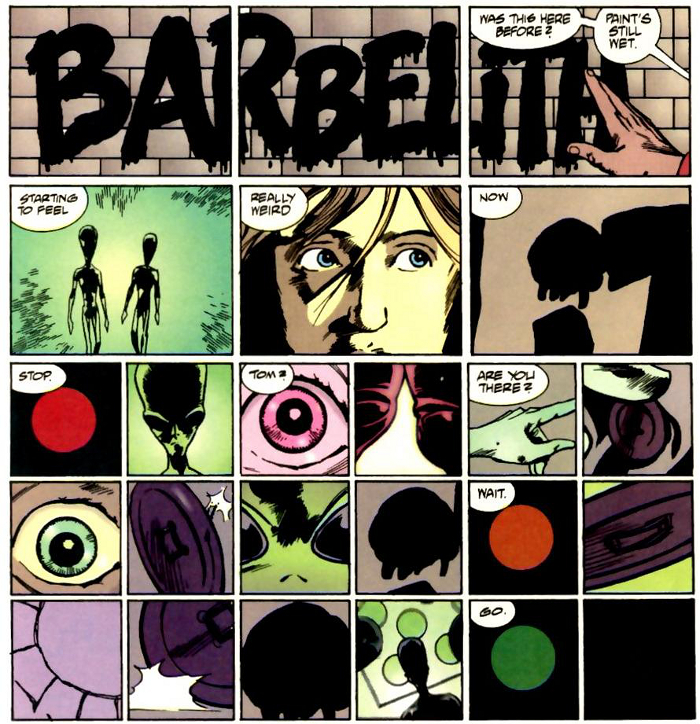 The next day while writing a bit for The Invisibles, caveating again that he’d taken a little hash but that the “effect” hadn’t been like anything he’d taken before (or after, rapidly firing off the various substances he’d tried). He talked about how the landscape had transformed, “pipes coming out the back, spirituality venting” out of the temple, went to lie down and blobs came out the wall… like “bits of mercury floating in anti-gravity”, communicating with him and saying “Okay, you fucking asked for it…” and off they went to Alpha Centuari.